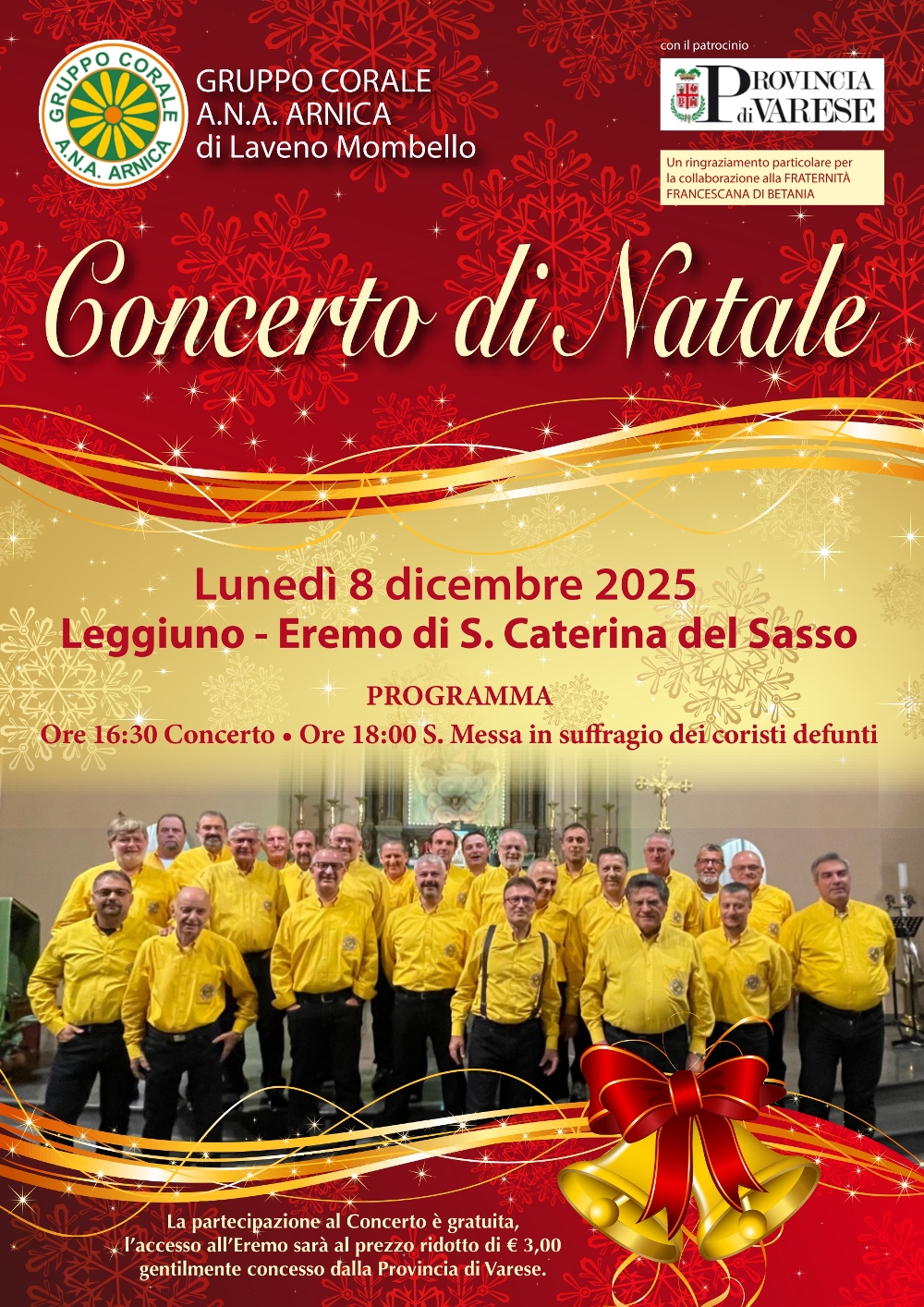 Il gruppo corale A.N.A. Arnica di Laveno Mombello vi aspetta il giorno 8 Dicembre 2025 alle ore 16.30 per il tradizionale Concerto di Natale organizzato in collaborazione con la Freaternità Francescana di Betania.