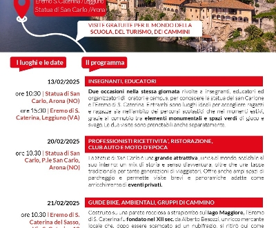 Statua di San Carlo ed Eremo di S. Caterina del Sasso, due luoghi noti ai più ma non a tutti e non in tutte le loro caratteristiche: per questo Archeologistics srl impresa sociale propone 3 momenti gratuiti di conoscenza, rivolti a specifici destinatari: docenti, educatori, guide ambientali e in bicicletta e gli operatori della ricettività. Tre g ...